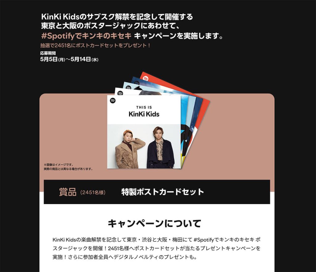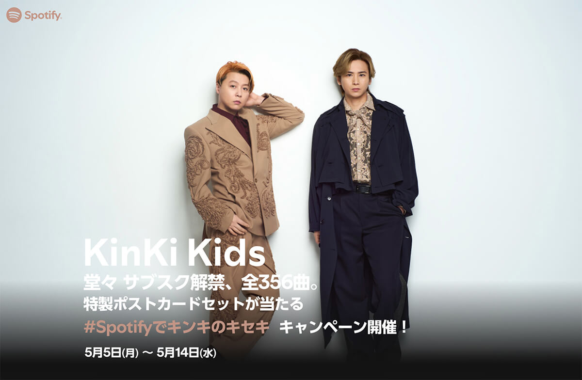 Spotify Spotifyでキンキのキセキ キャンペーン May 13th, 2025 Spotify Premium企画として、特製ポストカードが当たるプレゼント特設サイトを5月5日より公開しました。
